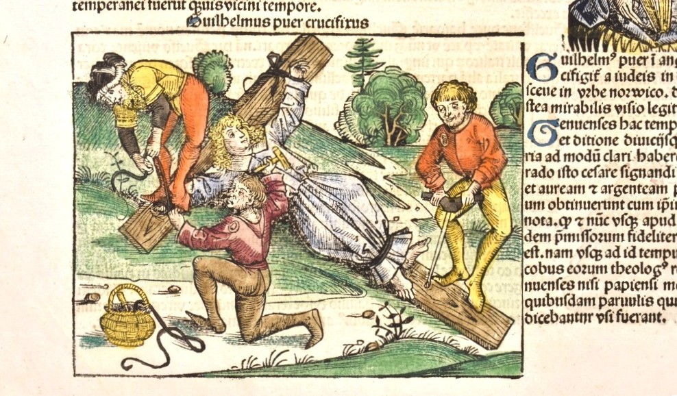 5. Denne illustrasjonen viser korsfestelsen av William, et barn, og viser ham bundet til et kors av tre menn identifisert som jøder på langfredag.