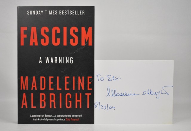 Madeleine Albright: Fascism - A Warning. Signert. Artikkelnr.: AS208 Madeleine Albright with Bill Woodward: Fascism - A Warning Vedlagt kort til boksamler og bibliofil Eilev (Høibakken) signert av Madeleine Albright, 8/23/04 NOK400,00 inkl. mva. På lager Kjøp Vipps hurtigkasseKjøp nå med Vipps hurtigkasse Del dette Produktinfo Produktanmeldelser (0) Madeleine Albright with Bill Woodward: Fascism - A Warning Vedlagt kort til boksamler og bibliofil Eilev (Høibakken) signert av Madeleine Albright, 8/23/04 William Collins 2019. 8vo. XIX + [1] + 228 s. Orig. omslag. Meget pen. Skriv en produktanmeldelse og del dine erfaringer med dette produktet med andre kunder. Email Navn Din vurdering? 1 star 2 star 3 star 4 star 5 star 6 star Oppgi en tittel for anmeldelsen din Skriv inn produktanmeldelsen i feltet under