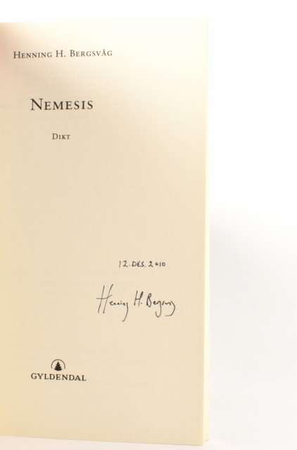 Henning H. Bergsvåg: Nemesis. Signert Artikkelnr.: 02579 Henning H. Bergsvåg: Nemesis. Dikt. Signert av Henning H. Bergsvåg, 12. Des. 2010 på tittelblad. NOK200,00 inkl. mva. På lager Kjøp Vipps hurtigkasseKjøp nå med Vipps hurtigkasse Del dette Produktinfo Produktanmeldelser (0) Henning H. Bergsvåg: Nemesis. Dikt. Signert av Henning H. Bergsvåg, 12. Des. 2010 på tittelblad. Gyldendal Norsk Forlag 2007. 8vo. 92 + [1] s. Orig. omslag. Skriv en produktanmeldelse og del dine erfaringer med dette produktet med andre kunder. Email Navn Din vurdering? 1 star 2 star 3 star 4 star 5 star 6 star Oppgi en tittel for anmeldelsen din Skriv inn produktanmeldelsen i feltet under