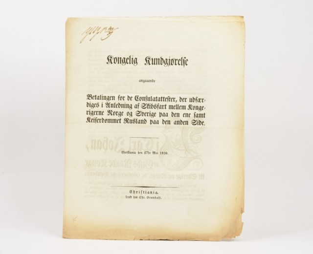 Kongelig Kundgjørelse angaaende Betalingen for de Consulattester, der udfærdiges i Anledning af Skibsfart mellem Kongerigerne Norge og Sverige paa den ene samt Keiserdømmet Rusland paa den anden Side.