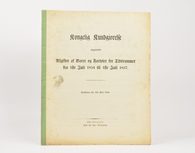 Kongelig Kundgjørelse angaaende de Afgifter af Varer og Fartøier for Tidsrummet fra 1ste Juli 1854 til 1ste Juli 1857.