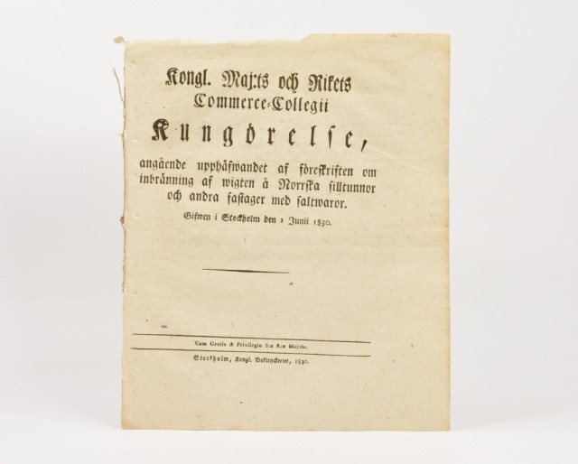 Kongl. Maj:ts Nådiga Kungörelse, angående upphåfwandet af föreskriften om inbränning af wigten å Norrska silltunnor och andra fastager med saltwaror.
