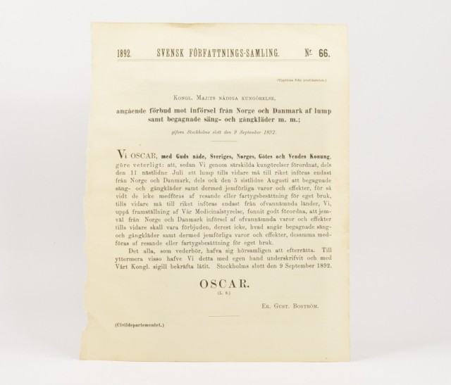 Kongl. Maj:ts Nådiga kungörelse, angående förbud mot införsel från Norge och Danmark af lump samt begagnade säng- och gångkläder m. m.;