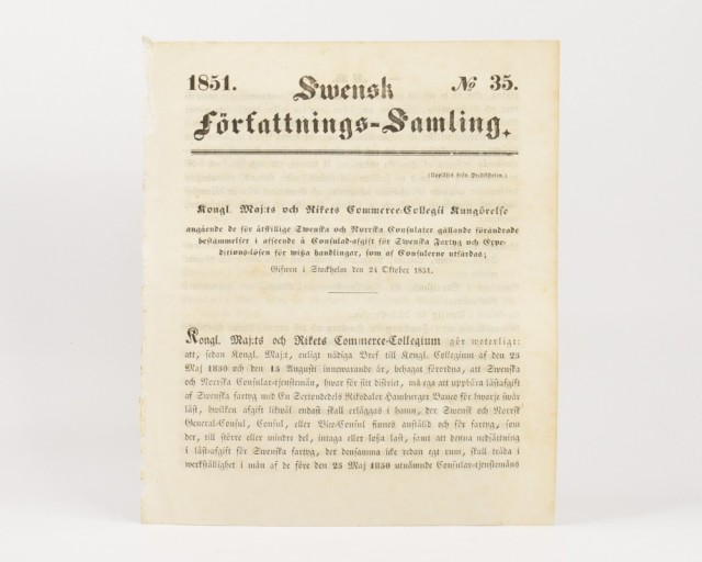 Kongl. Maj:ts och Rikets Commerce-Collegii Kungörelse angående de för Swenska och Norrska Consulater gällande förändrade bestämmelser i assende å Consulad-afgift för Swenska Fartyg och Expeditions-löften för wissa handlingar, som af Consulerna utfärdas;