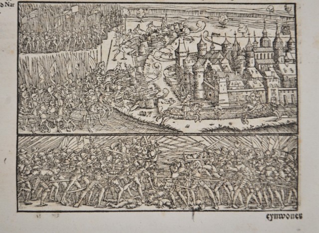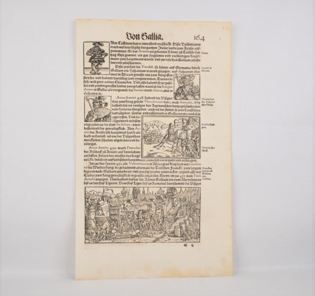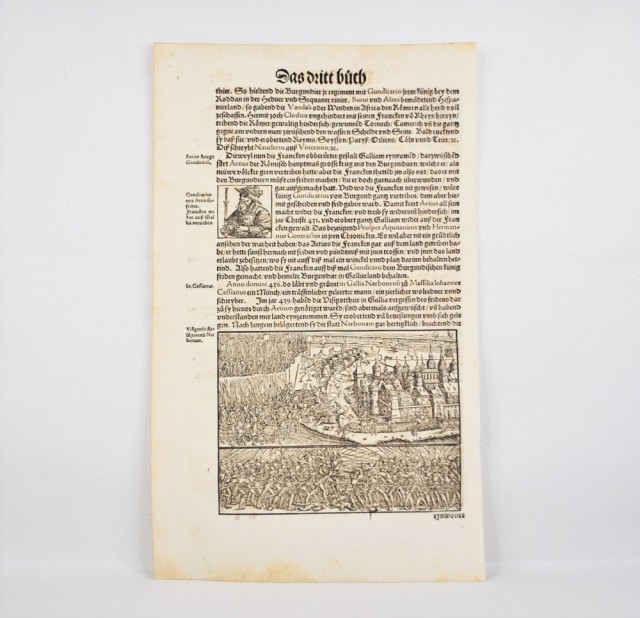 1548. 1. utgave. Folio tresnittblad: 37,3 x 23,2 cm. Trykk på begge sider. Rikt illustrert tresnittblad fra førsteutgaven av Stumpf Chronicle, et av de største illustrerte verkene fra tidlig til midten av 1500-tallet. Heinrich Vogtherr (den eldste) (1490 i Dillingen an der Donau - 1556 i Wien) var en kunstner, skriver, poet og medisinsk forfatter fra reformasjonstiden.