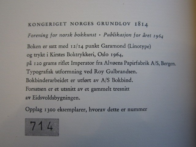 Kongeriget Norges Grundlov 1814. 714/1300 Artikkelnr.: H140 Kongeriget Norges Grundlov 1814. Topp gullsnitt. Opplag 1300 eksemplarer, hvorav dette er nummer 714. NOK200,00 inkl. mva. På lager Kjøp Vipps hurtigkasseKjøp nå med Vipps hurtigkasse Del dette Produktinfo Produktanmeldelser (0) Kongeriget Norges Grundlov 1814. Opplag 1300 eksemplarer, hvorav dette er nummer 714. Foreningen for Norsk Bokkunst. Oslo 1964. Liten tverr 8vo. 58 + (2) s. Orig. kunstskinnbd. med smussomslag. Topp gullsnitt. Skriv en produktanmeldelse og del dine erfaringer med dette produktet med andre kunder. Email Navn Din vurdering? 1 star 2 star 3 star 4 star 5 star 6 star Oppgi en tittel for anmeldelsen din Skriv inn produktanmeldelsen i feltet under