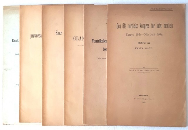 Den 6te nordiske kongres for indv. medicin. Skagen 28de-30te juni 1909. Referat ved Eyvin Wang. Kristiania 1909. 8vo. 48 s. Orig. omslag.