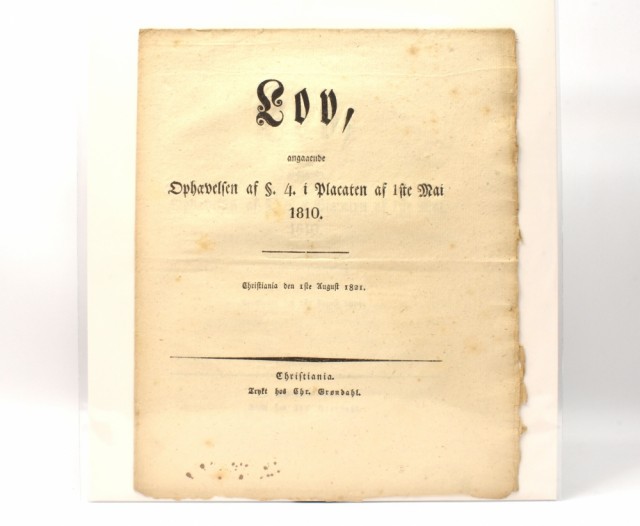Lov, angaaende Ophævelsen af §. 4. i Placaten af... 1821 Artikkelnr.: B329 Lov, angaaende Ophævelsen af §. 4. i Placaten af 1ste Mai 1810. Christiania den 1ste August 1821. NOK200,00 inkl. mva. På lager Kjøp Vipps hurtigkasseKjøp nå med Vipps hurtigkasse Del dette Produktinfo Produktanmeldelser (0) Lov, angaaende Ophævelsen af §. 4. i Placaten af 1ste Mai 1810. Christiania den 1ste August 1821. Trykt hos Chr. Grøndahl, Christiania [1821] 8vo. Ett ark, falset to ganger [4] s. Leveres i syrefri klar plastkonvolutt. Skriv en produktanmeldelse og del dine erfaringer med dette produktet med andre kunder. Email Navn Din vurdering? 1 star 2 star 3 star 4 star 5 star 6 star Oppgi en tittel for anmeldelsen din Skriv inn produktanmeldelsen i feltet under