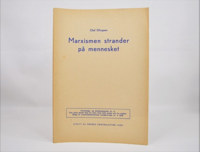 Olaf Ellingsen: Marxismen strander på mennesket. Artikkelnr.: B101 Olaf Ellingsen: Marxismen strander på mennesket. NOK50,00 inkl. mva. På lager Kjøp Vipps hurtigkasseKjøp nå med Vipps hurtigkasse Del dette Produktinfo Produktanmeldelser (0) Olaf Ellingsen: Marxismen strander på mennesket. Utgitt av Høires Centralstyre 1939. 8vo. 81 s. Orig. omslag. Bilag til Generalsekretærens rundskrivelse nr. 4 1939. Skriv en produktanmeldelse og del dine erfaringer med dette produktet med andre kunder. Email Navn Din vurdering? 1 star 2 star 3 star 4 star 5 star 6 star Oppgi en tittel for anmeldelsen din Skriv inn produktanmeldelsen i feltet under