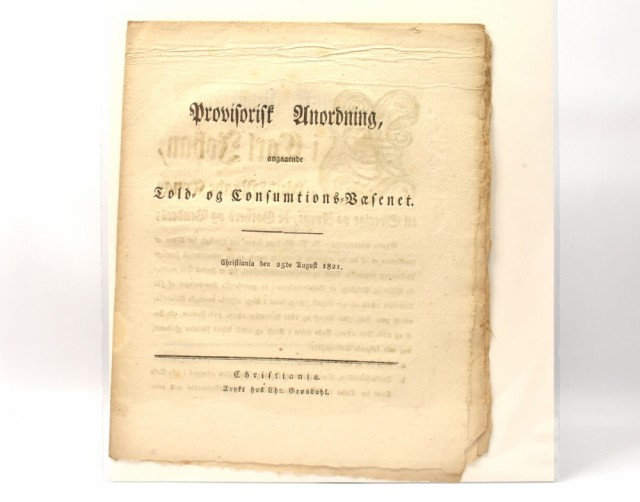 Provisorisk Anordning, angaaende Told- og... 1821 Artikkelnr.: B325 Provisorisk Anordning, angaaende Told- og Consumptions-Væsenet. Christiania den 25de August 1821. NOK200,00 inkl. mva. På lager Kjøp Vipps hurtigkasseKjøp nå med Vipps hurtigkasse Del dette Produktinfo Produktanmeldelser (0) Provisorisk Anordning, angaaende Told- og Consumptions-Væsenet. Christiania den 25de August 1821. Trykt hos Chr. Grøndahl, Christiania [1821] 8vo. Ett ark, falset en gang [4] s. Leveres i syrefri klar plastkonvolutt. Skriv en produktanmeldelse og del dine erfaringer med dette produktet med andre kunder. Email Navn Din vurdering? 1 star 2 star 3 star 4 star 5 star 6 star Oppgi en tittel for anmeldelsen din Skriv inn produktanmeldelsen i feltet under