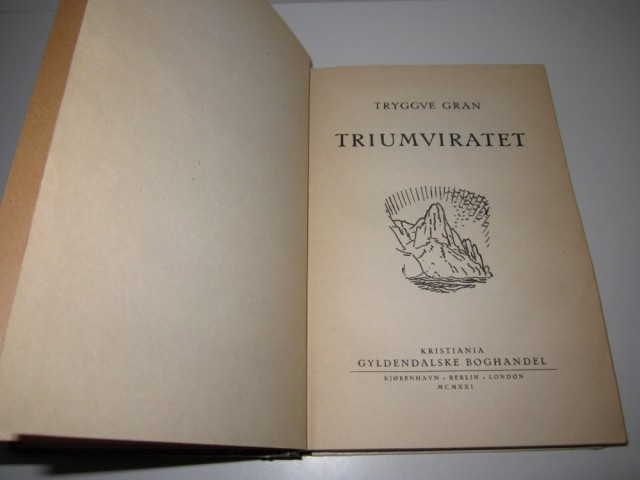 Tryggve Gran: Triumviratet. Artikkelnr.: SK002 Tryggve Gran: Triumviratet. NOK400,00 inkl. mva. På lager Kjøp Vipps hurtigkasseKjøp nå med Vipps hurtigkasse Del dette Produktinfo Produktanmeldelser (0) Tryggve Gran: Triumviratet. Gyldendalske Boghandel Kristiania MCMXXI 1921. 8vo. 168 s. Orig. kartonert innbd. Litt skjev rygg. Baksatsbladet mangler (blankt ark), for øvrig meget pen. Skriv en produktanmeldelse og del dine erfaringer med dette produktet med andre kunder. Email Navn Din vurdering? 1 star 2 star 3 star 4 star 5 star 6 star Oppgi en tittel for anmeldelsen din Skriv inn produktanmeldelsen i feltet under