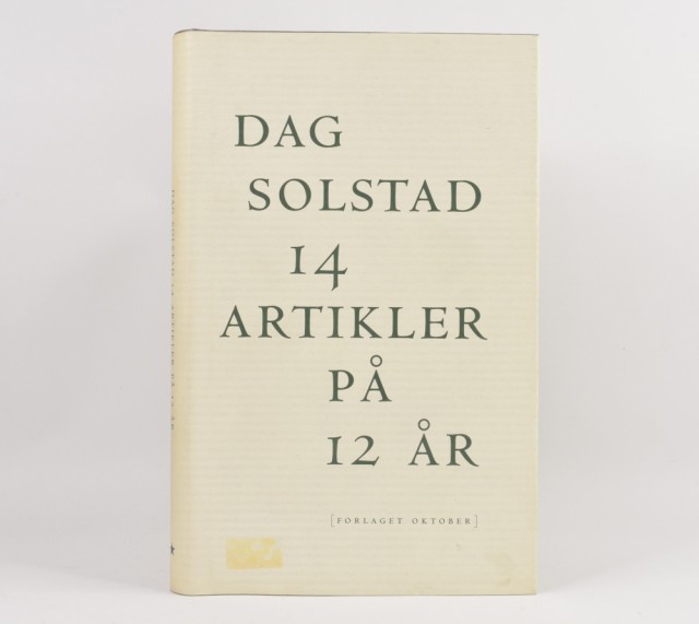 Dag Solstad: 14 artikler på 12 år. Artikkelnr.: SF010 Dag Solstad: 14 artikler på 12 år. NOK100,00 inkl. mva. På lager Kjøp Vipps hurtigkasseKjøp nå med Vipps hurtigkasse Del dette Produktinfo Produktanmeldelser (0) Dag Solstad: 14 artikler på 12 år. Forlaget Oktober, Oslo 1993. 8vo. 148 s. Orig. bd. med smussomslag. Ørliten rift i smussomslag. Spor etter prislapp. Skriv en produktanmeldelse og del dine erfaringer med dette produktet med andre kunder. Email Navn Din vurdering? 1 star 2 star 3 star 4 star 5 star 6 star Oppgi en tittel for anmeldelsen din Skriv inn produktanmeldelsen i feltet under