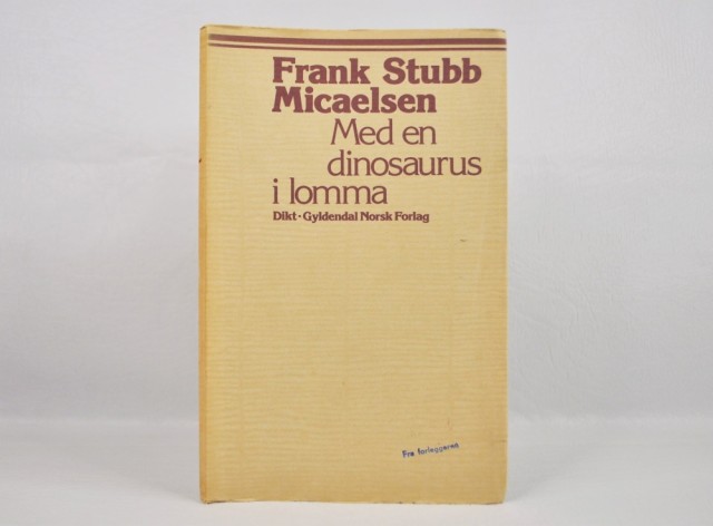 Frank Stubb Micaelsen: Med en dinosaur i lomma. Artikkelnr.: 02397 Frank Stubb Micaelsen: Med en dinosaur i lomma. Dikt. NOK100,00 inkl. mva. På lager Kjøp Vipps hurtigkasseKjøp nå med Vipps hurtigkasse Del dette Produktinfo Produktanmeldelser (0) Frank Stubb Micaelsen: Med en dinosaur i lomma. Dikt. Gyldendal Norsk Forlag, Oslo 1977. 8vo. 87 s. Orig. omslag. Lite stempel på omslagets front (Fra forleggeren) Skriv en produktanmeldelse og del dine erfaringer med dette produktet med andre kunder. Email Navn Din vurdering? 1 star 2 star 3 star 4 star 5 star 6 star Oppgi en tittel for anmeldelsen din Skriv inn produktanmeldelsen i feltet under