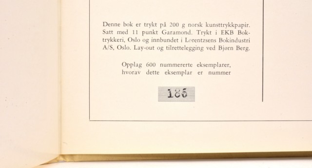 Opplag 600 nummererte eksemplarer, hvorav dette eksemplar er nummer 185.