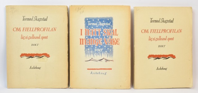 Aschehoug Oslo 1946-1947. 8vo. 62 + [1] + 66 + [1] s. Orig. omslag. Fuktmerke i øvre marg siste 3 sider på, I natt skal...