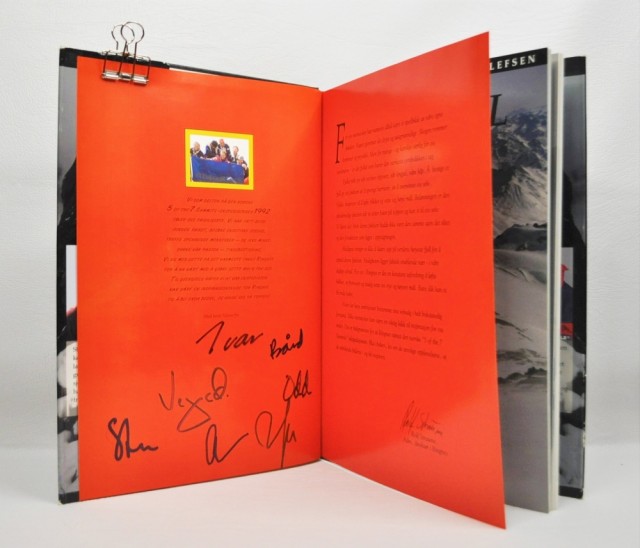 Signert av Ivar (Tollefsen) Vegard (Ulvang) Bård (Stokkan) Stein (P. Aasheim) A(rne) Næss)) Odd (Eliassen) Ralph (Høibakk) på dedikasjon bladet.
