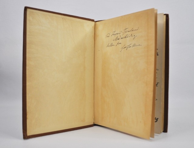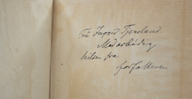 Dedikasjon på forsatsbladet signert av forfatteren.