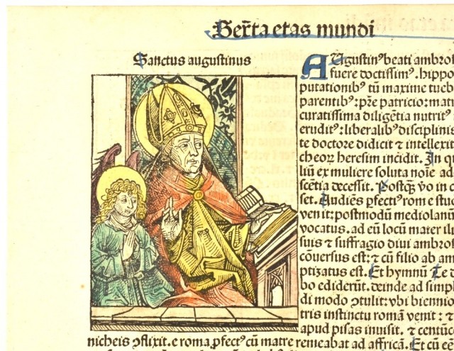 1. Augustin, en av kirkens fire fedre eller leger, er avbildet iført episkopale klær som biskop av Hippo, sittende foran en lesepult med åpne bøker; hans høyre hånd løftes i velsignelse mens et barn kneler ved siden av ham i bønn.