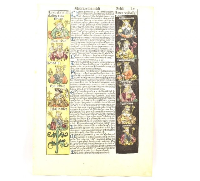 De vakkert fargede tresnittene til Folio LV illustrerer på rektosiden av foliumet to forskjellige konger. Den ene er Kristi slekt som inkluderer fem konger: Ussia, Jotam, Akas, Hiskia, Manasse. Videre er det slekten til assyriske konger, som inkluderer seks konger: Sardanapalus, Pul, Tiglat-Pileser, Shalmaneser, Sankerib og Esar-Haddon.