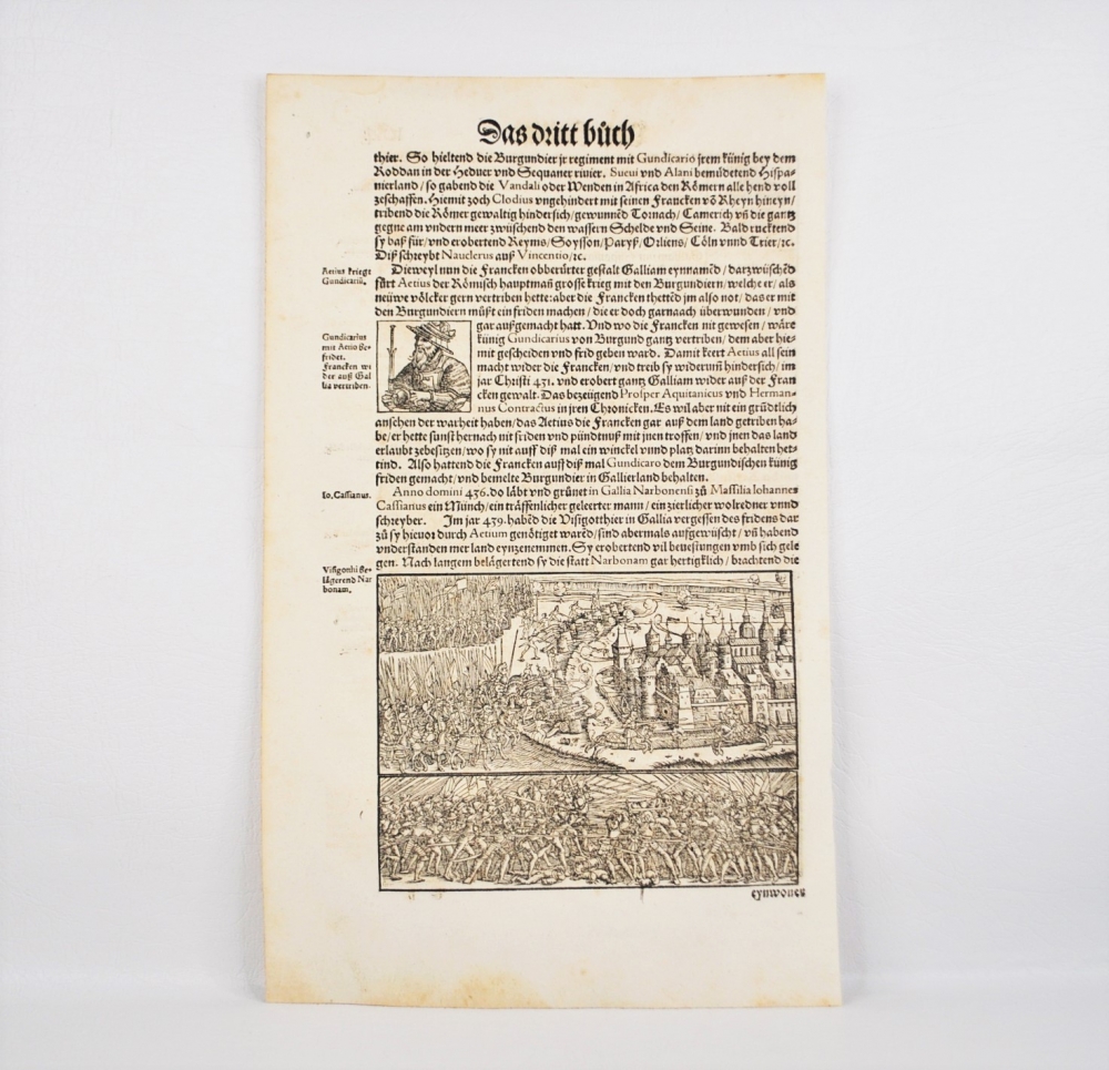 1548. 1. utgave. Folio tresnittblad: 37,3 x 23,2 cm. Trykk på begge sider. Rikt illustrert tresnittblad fra førsteutgaven av Stumpf Chronicle, et av de største illustrerte verkene fra tidlig til midten av 1500-tallet. Heinrich Vogtherr (den eldste) (1490 i Dillingen an der Donau - 1556 i Wien) var en kunstner, skriver, poet og medisinsk forfatter fra reformasjonstiden.