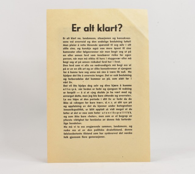 Er alt klart? Artikkelnr.: NS224 Er alt klart? Uten utgiver. Uten år [1941?]. 8vo. Et ark med trykk på begge sider. NOK100,00 inkl. mva. På lager Kjøp Vipps hurtigkasseKjøp nå med Vipps hurtigkasse Del dette Produktinfo Produktanmeldelser (0) Er alt klart? Uten utgiver. Uten år [1941?]. 8vo. Et ark med trykk på begge sider. Skriv en produktanmeldelse og del dine erfaringer med dette produktet med andre kunder. Email Navn Din vurdering? 1 star 2 star 3 star 4 star 5 star 6 star Oppgi en tittel for anmeldelsen din Skriv inn produktanmeldelsen i feltet under