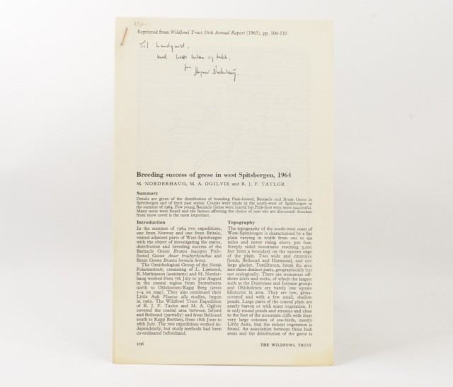 Reprinted from Wildfowl Trust 16th Annual Report (1965), pp. 106-110. 8vo. Stiftet i hjørne.