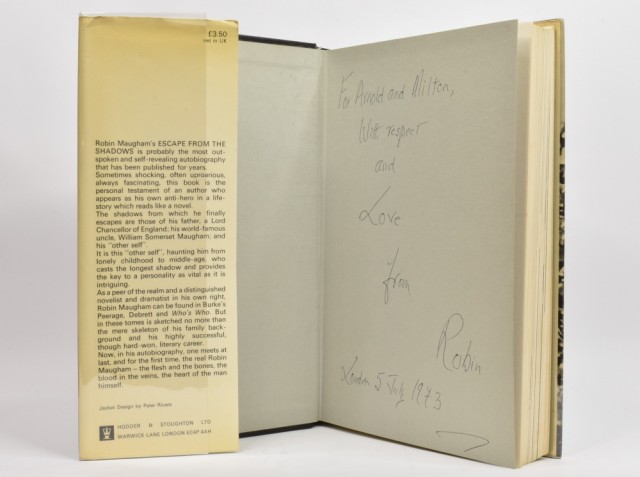 Dedication to Arnold and Milton, London 6 July 1973 from Robin on first end paper. John Nesfield's name on first end paper. Also signed by Robin Maugham on tittle page.