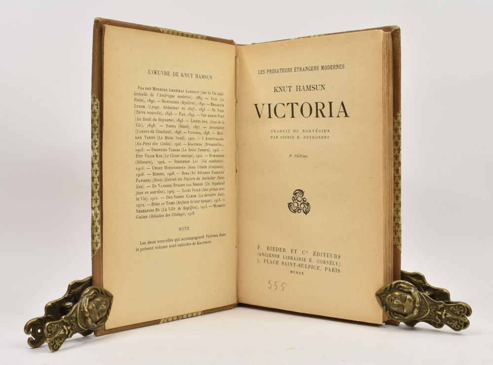 Knut Hamsun: Victoria. Artikkelnr.: SK268 Knut Hamsun: Victoria. Traduit de Norvégien par Sigrid R. Peyronnet. NOK100,00 inkl. mva. På lager Kjøp Vipps hurtigkasseKjøp nå med Vipps hurtigkasse Del dette Produktinfo Produktanmeldelser (0) Knut Hamsun: Victoria. Traduit de Norvégien par Sigrid R. Peyronnet. F. Rieder et Cic Éditeurs, Paris. 4e èdition MCMXX. 8vo. 227 + [2] s. Priv. halvsjirtingbd. med orig. fram og bakomslag + ryggstripe medbundet. Skriv en produktanmeldelse og del dine erfaringer med dette produktet med andre kunder. Email Navn Din vurdering? 1 star 2 star 3 star 4 star 5 star 6 star Oppgi en tittel for anmeldelsen din Skriv inn produktanmeldelsen i feltet under