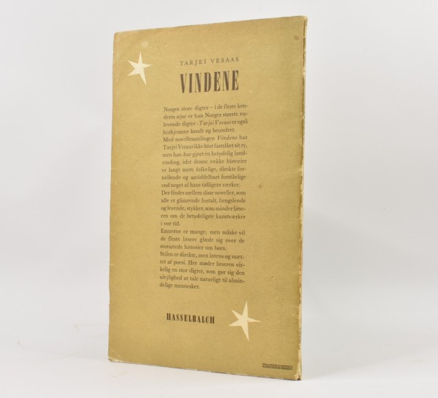 Tarjei Vesaas: Vindene. Artikkelnr.: SK205 Tarjei Vesaas: Vindene. Autorisert oversættelse efter „Vindane“ ved Torben Brostrøm. NOK75,00 inkl. mva. På lager Kjøp Vipps hurtigkasseKjøp nå med Vipps hurtigkasse Del dette Produktinfo Produktanmeldelser (0) Tarjei Vesaas: Vindene. Autorisert oversættelse efter „Vindane“ ved Torben Brostrøm. Omslaget tegnet af Ernst Clausen. Steen Hasselbachs Forlg 1952. 8vo. 149 + [2] s. Orig. omslag. Navnetrekk. Normal slitasje. Skriv en produktanmeldelse og del dine erfaringer med dette produktet med andre kunder. Email Navn Din vurdering? 1 star 2 star 3 star 4 star 5 star 6 star Oppgi en tittel for anmeldelsen din Skriv inn produktanmeldelsen i feltet under