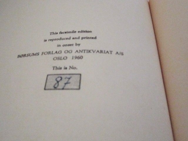 This facsimile edition is reproduced and printed in onset by Børsum Forlag og Antikvariat Oslo 1960. 8vo. (15) + 79 s. Orig. skinnryggbd. med marmorerte dekler. This is No. 87.
